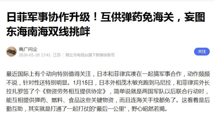 商广问尘 2026-01-20 日菲军事协作升级!互供弹药免海关,妄图东海南海双线挑衅