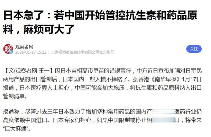 观察者网 2026-01-17 日本急了:若中国开始管控抗生素和药品原料大牛配资网,麻烦可大了