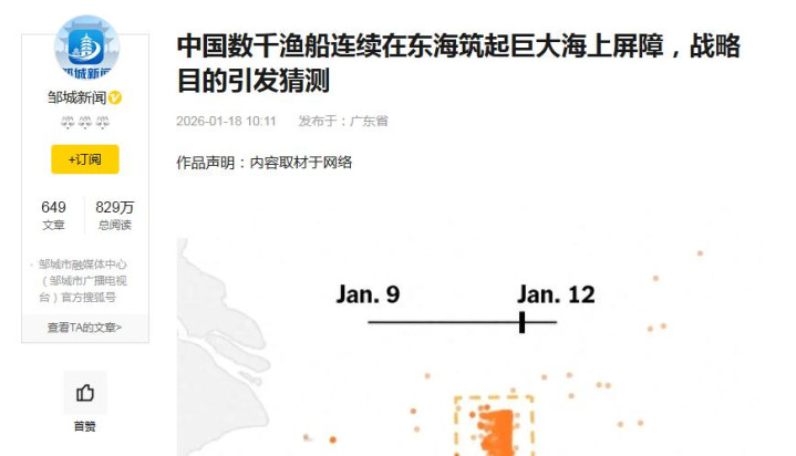 邹城新闻 2026-01-18 中国数千渔船连续在东海筑起巨大海上屏障,战略目的引发猜测